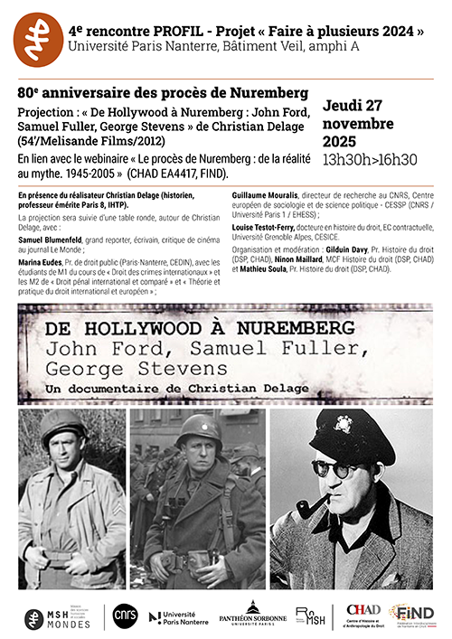 Le programme PROFIL (PROcès FILmés) s’inscrit dans la continuité de celui qui, au sein du LABEX « Les passés dans le présent », portait sur « Les procès filmés, une mémoire vive. De Nuremberg au procès du 13 novembre 2015 » (IHTP/Archives nationales). PROFIL est soutenu par la MSH-Mondes (« Faire à plusieurs 2024 »), l’INIST-CNRS, le CHAD (Centre d’Histoire et d’Anthropologie du Droit, EA 4417) et bénéficie d’un financement Recherche Paris Lumière Alliance (2024).