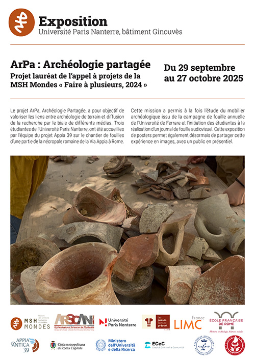 Le projet ArPa, Archéologie Partagée, a pour objectif de valoriser les liens entre archéologie de terrain et diffusion de la recherche par le biais de différents médias. Le partenariat entre la MSH-Mondes, le Labex Les Passés dans le Présent, l’Université Paris Nanterre, le laboratoire ArScAn, l’École Française de Rome et l’Università degli Studi di Ferrara a permis l’organisation d’une mission pour trois étudiantes de l’Université Paris Nanterre, accueillies par l’équipe du projet Appia 39 sur le chantier de fouilles d’une partie de la nécropole romaine de la Via Appia à Rome.