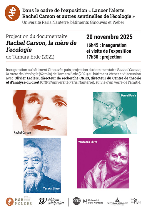La MSH Mondes organise l’exposition « Lancer l’alerte. Rachel Carson et autres sentinelles de l’écologie » afin de sensibiliser la communauté universitaire au rôle des lanceurs d’alerte sur les sujets du changement climatique, de l’effondrement de la biodiversité, le dépassement des limites planétaires. L’exposition est centrée sur 4 figures emblématiques, Tanaka Shozo, Rachel Carson, Vandanda Shiva et Daniel Pauly. Elle est réalisée par les éditions Wildproject en 2022 et est pleinement d’actualité.