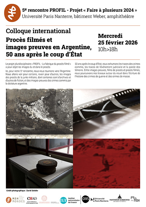 Le projet pluridisciplinaire « PROFIL – La fabrique du procès filmé » a pour objet les images du et dans le procès. Ici, pour notre 5e rencontre, nous nous tournons vers l’Argentine. Nous allons voir pour certains, revoir pour d’autres, les images des procès de la junte militaire, dont certaines sont d’archives et d’autres de fiction, et des images-preuves des crimes commis par la dictature argentine. 50 ans après le coup d’Etat, nous exhumons les traces des crimes commis, les traces de l’événement judiciaire et la parole des témoins. Entre images-preuves, films de procès et procès filmés, nous poursuivons nos travaux autour du visuel dans l’écriture de l’histoire.